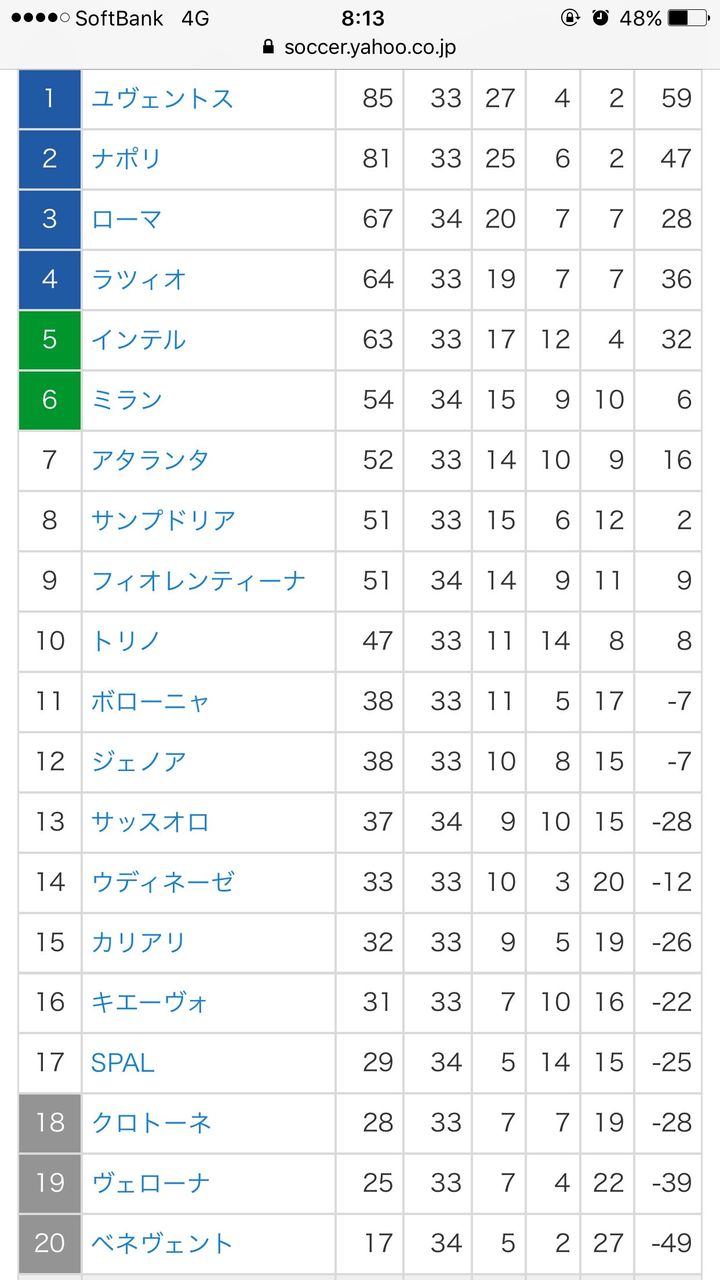 アタランタが勝ったら7位転落やで
