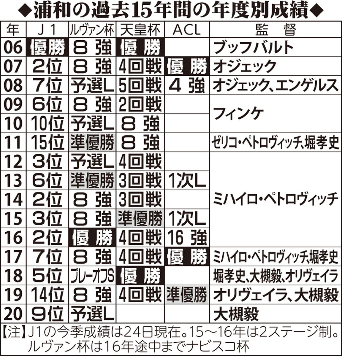 浦和は昨オフ、3カ年計画を発表。20年は「浦和の責任」「攻守に切れ目なく相手を休ませないプレー」などのコンセプト浸透に充て22年のリーグ制覇を掲げる。大槻監督で迎えた改革元年は現在9位。大敗する試合も目立ち目標のACL圏内、得失点差+2桁は微妙な状況。来季編成も迫る中、クラブ側は今月中旬を期限に新体制への移行を決めた。