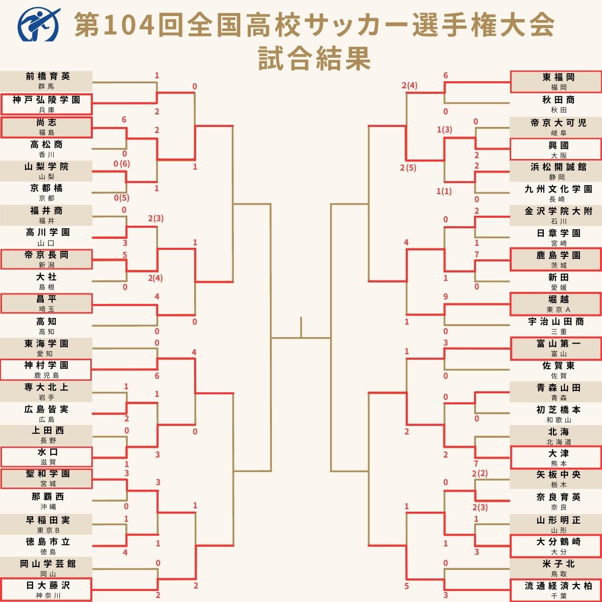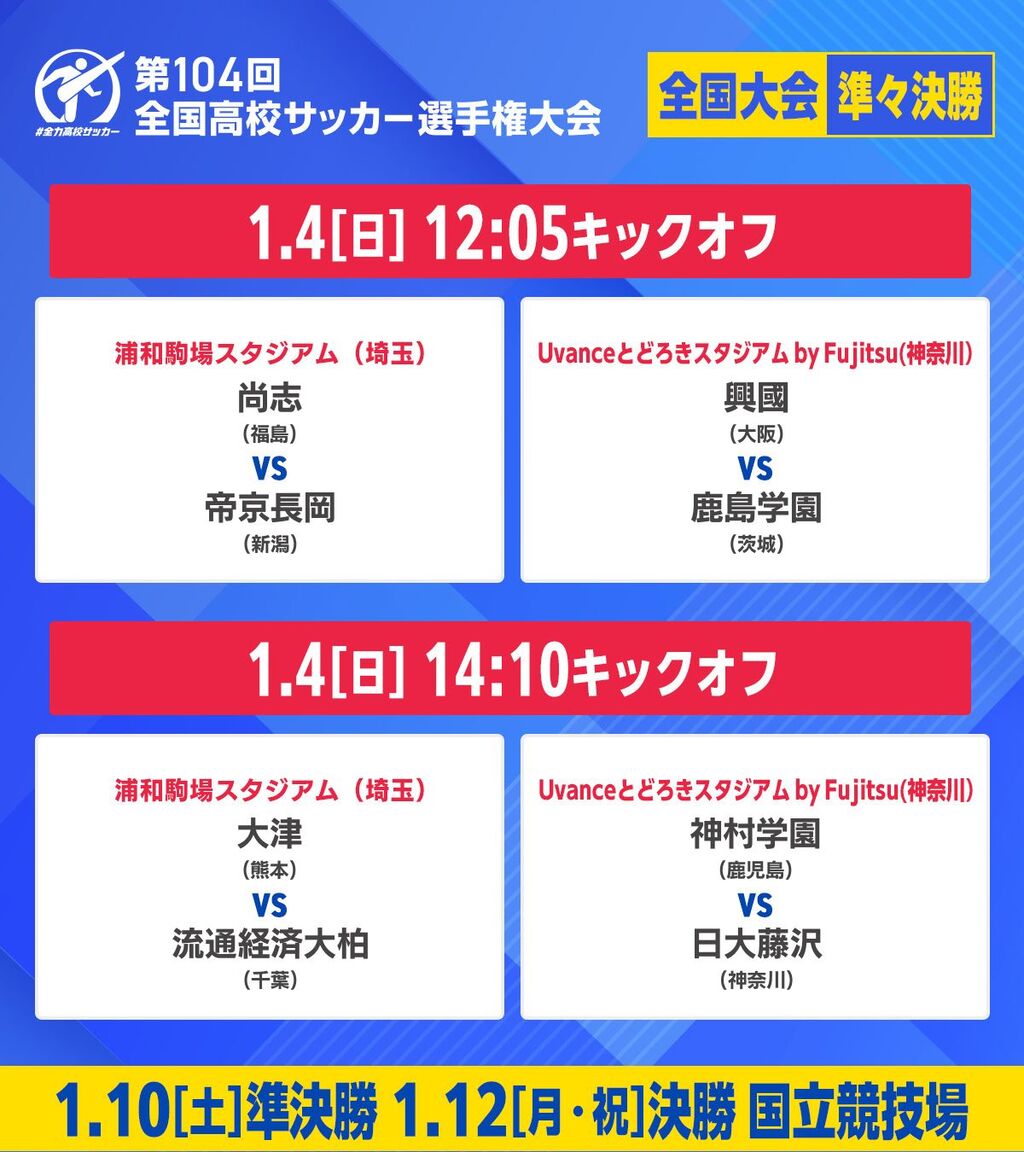 1月4日、第104回全国高校サッカー選手権の準々決勝・第1試合の2ゲームが開催され、尚志、鹿島学園が4強に駒を進めた。