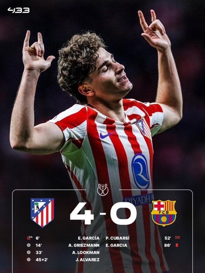前半だけで4-0。コパ・デル・レイ準決勝という大舞台で、これほど一方的な試合になるとは衝撃です。