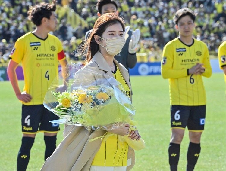 柏レイソルが横浜F・マリノスを3発逆転勝利したこの試合の前に、SNSをざわつかせた来場者がいた。柏FW小屋松知哉の妻だ。前節・湘南戦でJ1通算100試合出場を達成した小屋松の祝福のために、ピッチに登場したのだ。